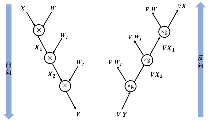 其中,黑色代表正向传播,红色代表反向传播。对于反向传播,有如下计算顺序: