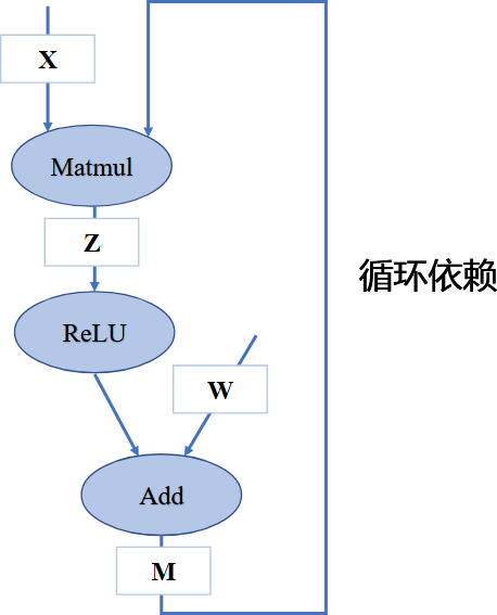 - 间接依赖:节点Add间接依赖于节点Matmul1,即节点Matmul1的数据并未直接传输给节点Add,而是经过了某个或者某些中间节点进行处理后再传输给节点Add,而这些中间节点可能是节点Add的直接依赖节点,也可能是间接依赖节点;