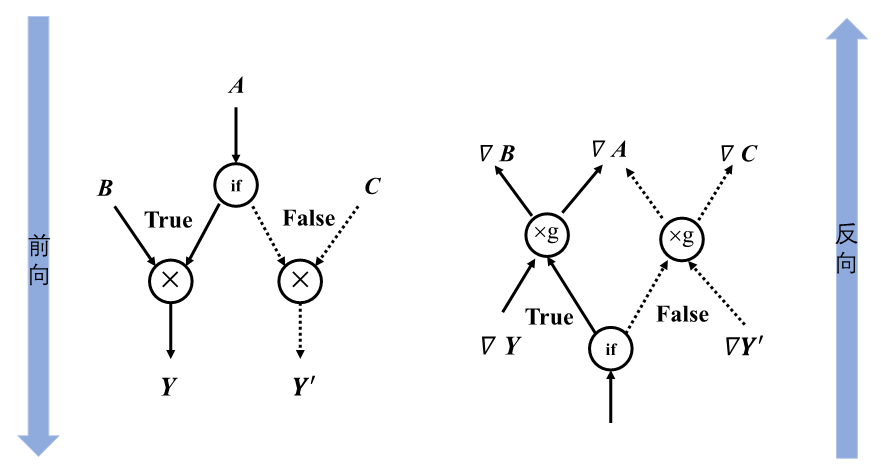 下图描述了条件控制代码的前向计算图和反向计算图:
